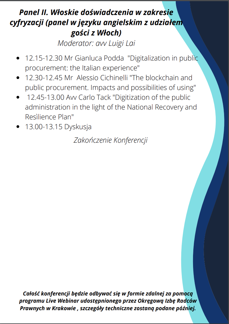 Nel corso di tale conferenza internazionale, l’Avv. Alessio Cicchinelli svolgerà una relazione sugli ambiti di applicazione della tecnologia blockchain in tema di contrattualistica pubblica, con particolare riferimento alla qualificazione delle imprese nei lavori pubblici, portando l’esperienza italiana come modello in chiave comparata. L’Avv. Gianluca Podda svolgerà una relazione sulla digitalizzazione nelle gare d’appalto in Italia e sui profili di pubblicità e trasparenza che caratterizzano il mercato italiano, in chiave comparativa con gli Stati Membri dell’Unione Europea.