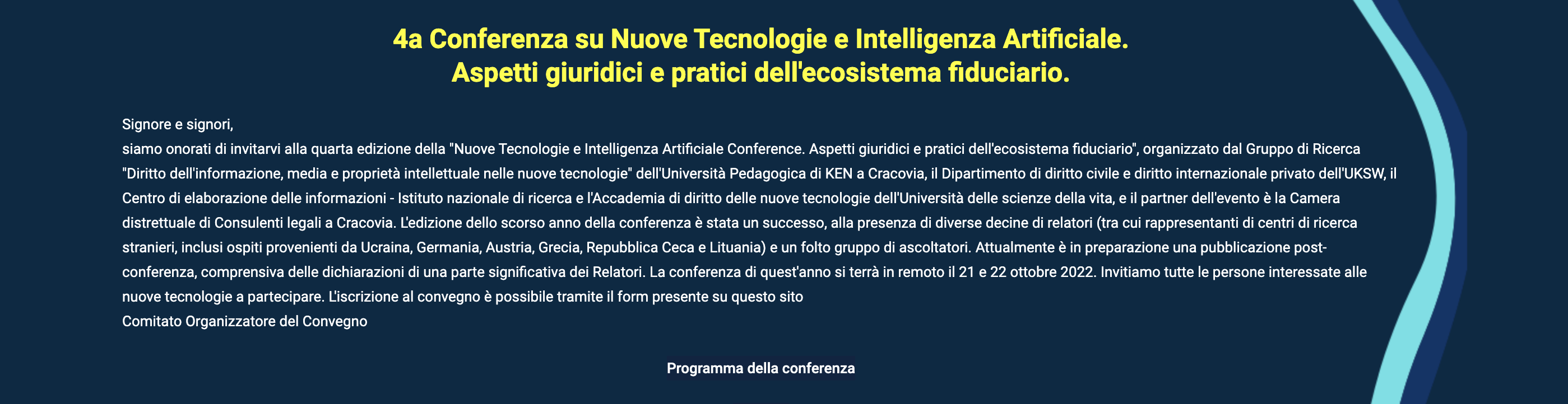 Il 21 e 22 ottobre 2022, gli Avvocati Alessio Cicchinelli e Gianluca Podda dello Studio Legale Piselli & Partners parteciperanno alla IV Conferenza Internazionale sulle Nuove Tecnologie e l’Intelligenza Artificiale organizzata dal gruppo di ricerca sul diritto dell’informazione, media e proprietà intellettuale in nuove tecnologie della Pedagogical University of Krakow (Cracovia, Polonia), in collaborazione con  il National Information Processing Institute di Cracovia e con il Dipartimento di diritto civile e internazionale privato della Facoltà di Giurisprudenza della Cardinal Stefan Wyszyński University in Warsaw (Varsavia, Polonia).