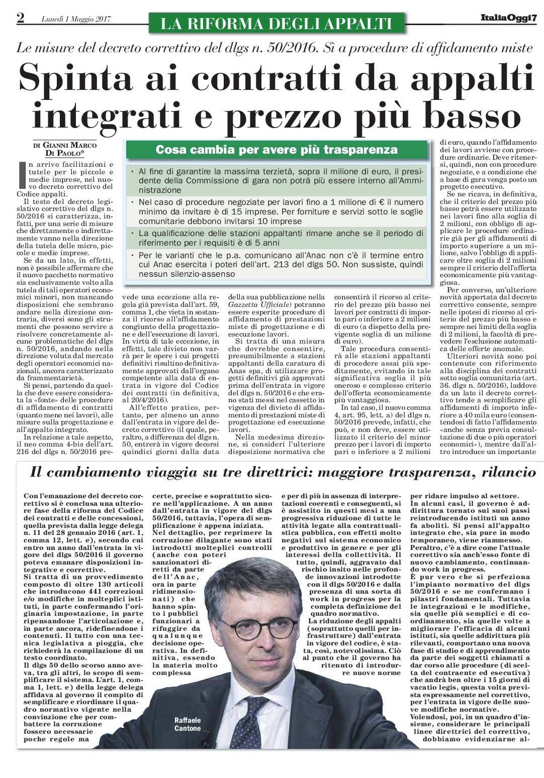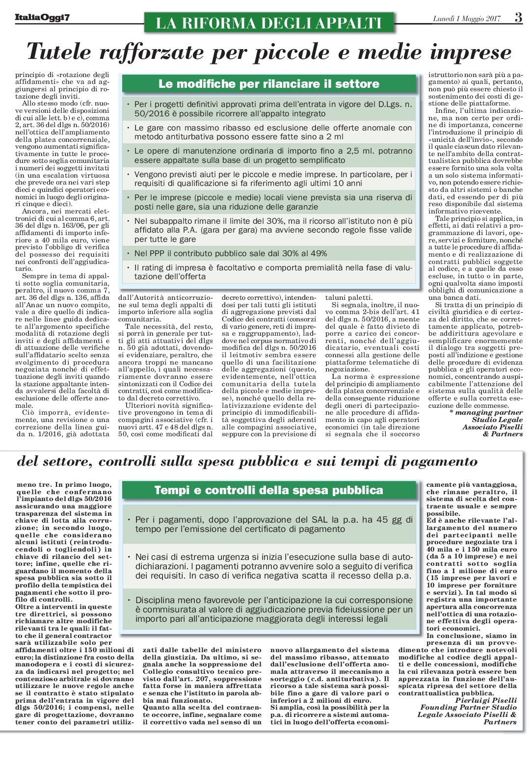 RIFORMA APPALTI: SU ITALIA OGGI DEL 1 MAGGIO 2017 GLI ARTICOLI DEGLI AVV.TI PIERLUIGI PISELLI E GIANNI MARCO DI PAOLO