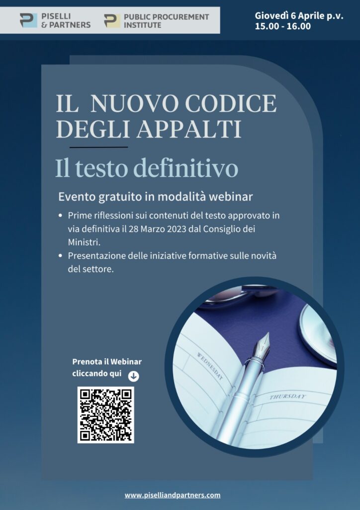APPROVATO IN VIA DEFINITIVA DAL CDM IL NUOVO CODICE DEI CONTRATTI PUBBLICI: TUTTE LE NOVITA’ NEL WEBINAR GRATUITO DI PISELLI&PARTNERS
