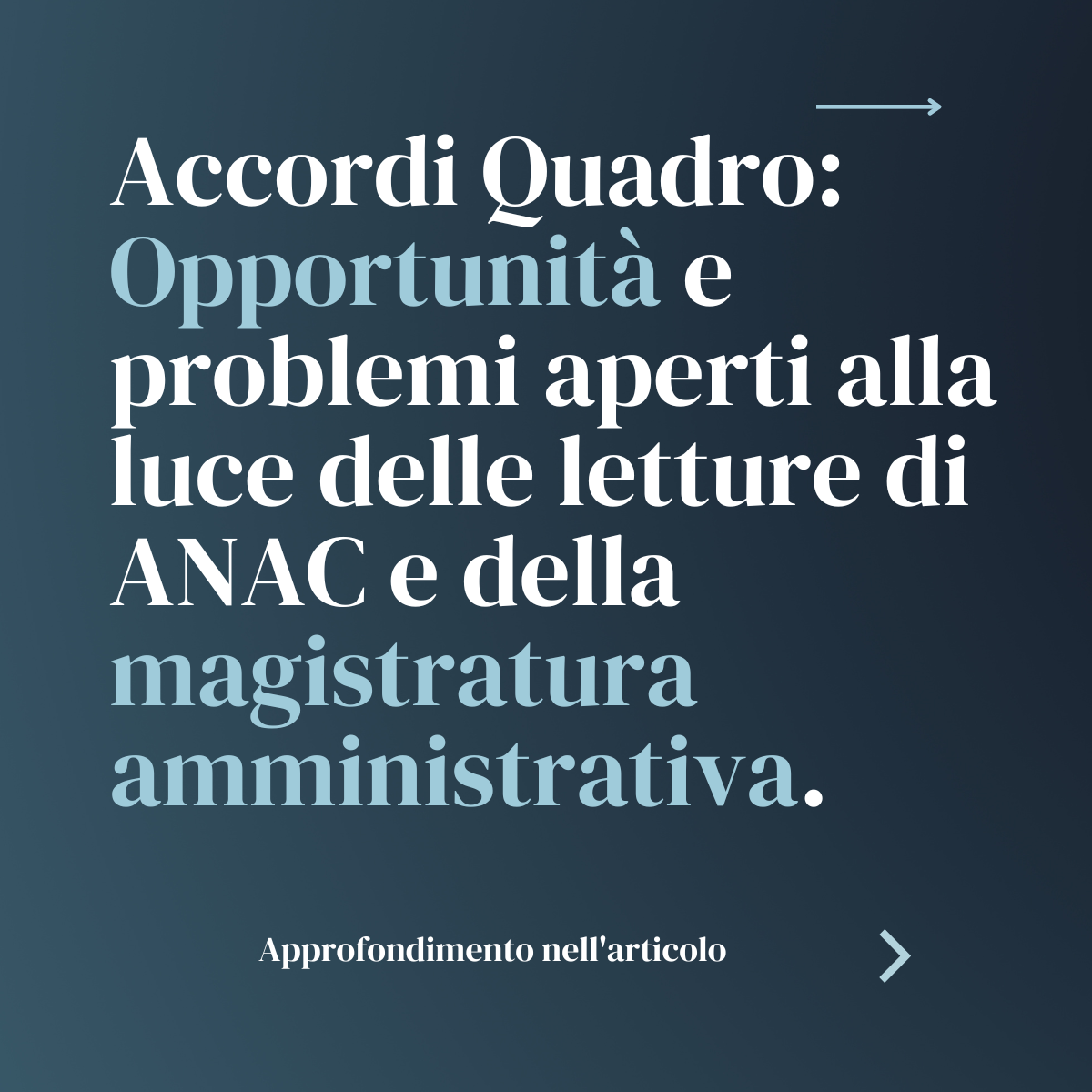 L’Accordo Quadro è uno strumento contrattuale sempre più utilizzato dalle stazioni appaltanti per la gestione dei contratti pubblici. L’aumentato interesse degli operatori per un istituto da tempo presente nella legislazione di settore, a livello nazionale e comunitario, testimoniato dai numerosi recenti interventi della magistratura amministrativa e dell’Anac volti a precisarne le relative modalità applicative, si spiega anche con la sua utilità per l’attuazione degli investimenti legati al PNRR, specie sul delicato fronte degli incarichi tecnici.