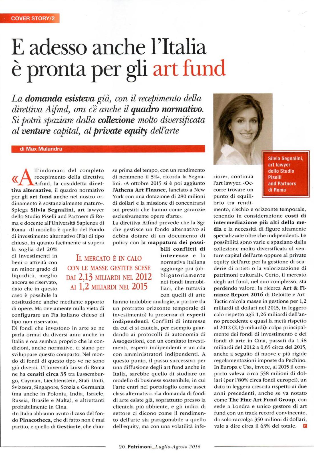 Spiega Silvia Segnalini, art lawyer del nostro Studio: “All’indomani del completo recepimento della direttiva Aifmd, la cosiddetta direttiva alternative, il quadro normativo per gli art fund anche nel nostro ordinamento è sostanzialmente maturo.”