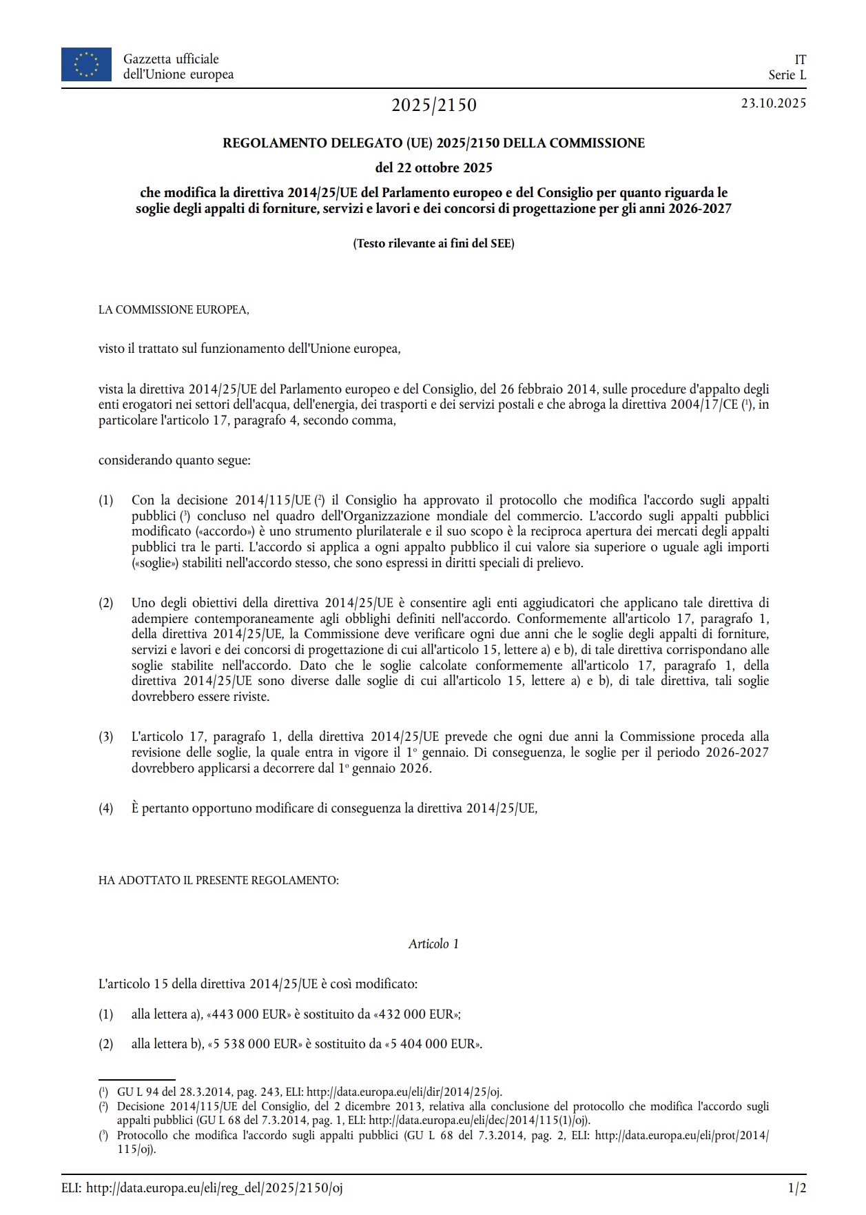Tali soglie sono state definite dall’Unione Europea con i Regolamenti delegati (UE) della Commissione del 22 ottobre 2025, nn. 2150, 2151 e 2152.