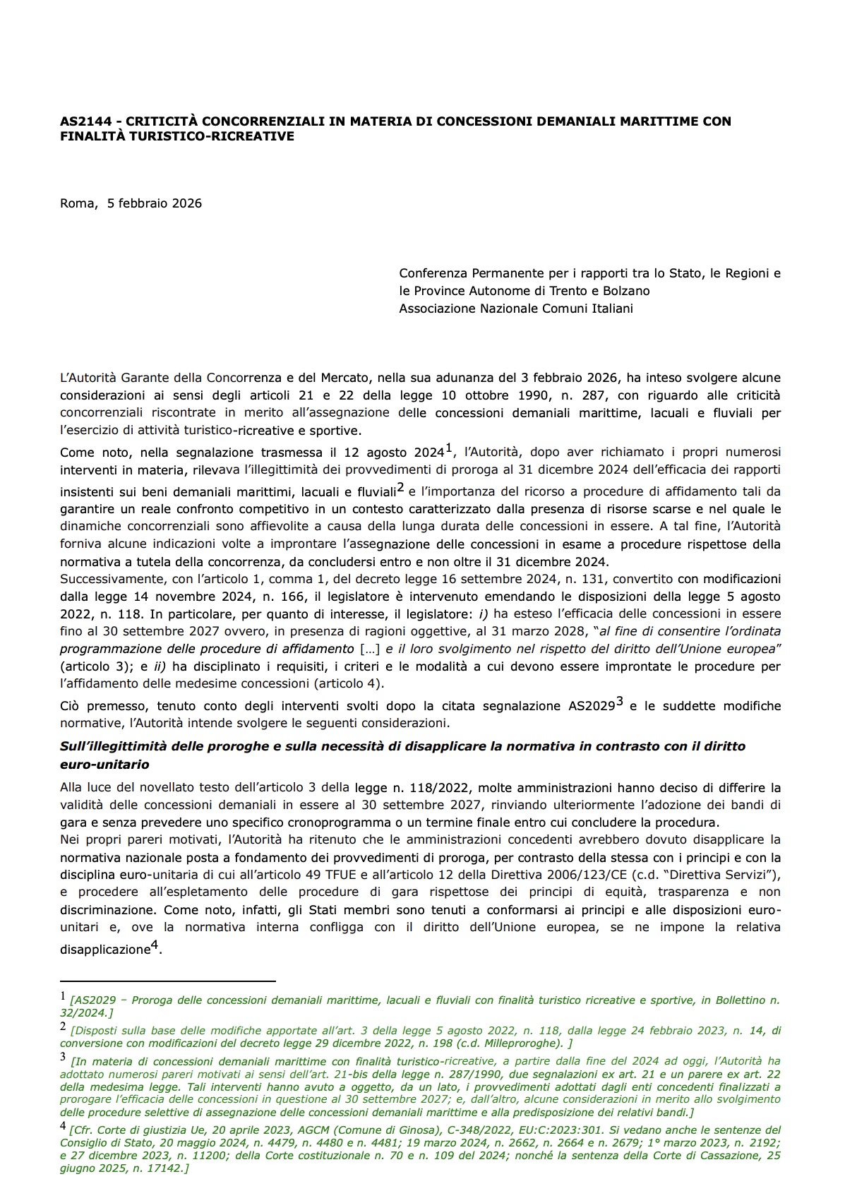 La pronuncia dell’AGCM, letta alla luce dell’attuale contesto giuridico, segnato dalla sentenza della Corte di Giustizia UE del 5 febbraio 2026, impone un ripensamento della disciplina applicabile ai procedimenti di affidamento delle concessioni demaniali marittime.