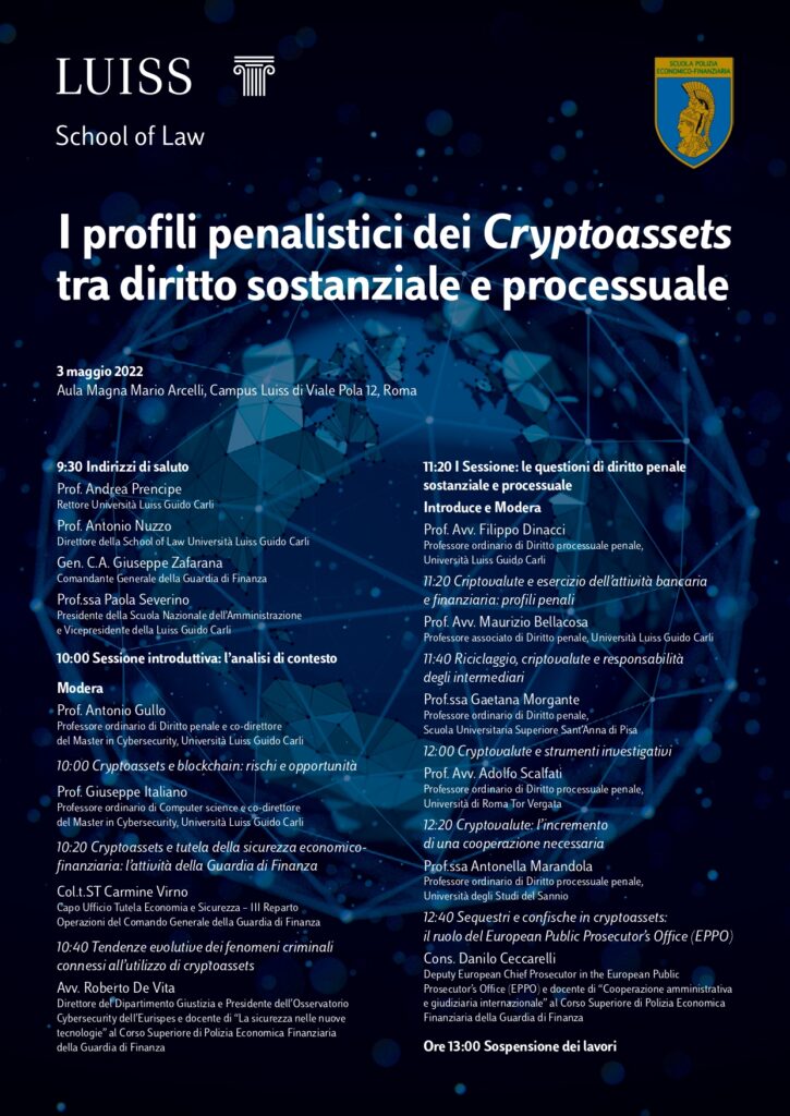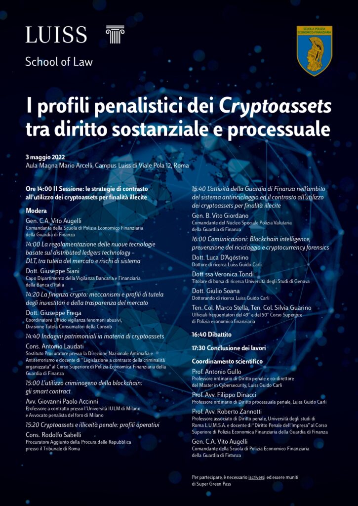Oggi 3 maggio 2022 l’Avv. Luca D’Agostino sarà tra i relatori del convegno “I profili penalistici dei cryptoassets tra diritto sostanziale e processuale”, organizzato dalla Luiss School Of Law, in collaborazione con la Scuola di Polizia economico-finanziaria della Guardia di Finanza.
