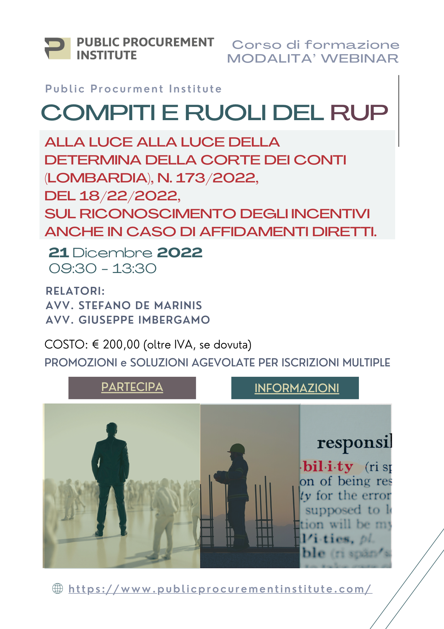 In merito a tale ambito i nostri Avvocati  Stefano De Marinis e Giuseppe Imbergamo, il prossimo 21 Dicembre 2022, realizzeranno un Webinar per Public Procurment Institute dal titolo : “COMPITI E RUOLI DEL RUP ALLA LUCE ALLA LUCE DELLA DETERMINA DELLA CORTE DEI CONTI (LOMBARDIA), N. 173/22, DEL 18/22/2022, SUL RICONOSCIMENTO DEGLI INCENTIVI ANCHE IN CASO DI AFFIDAMENTI DIRETTI.”