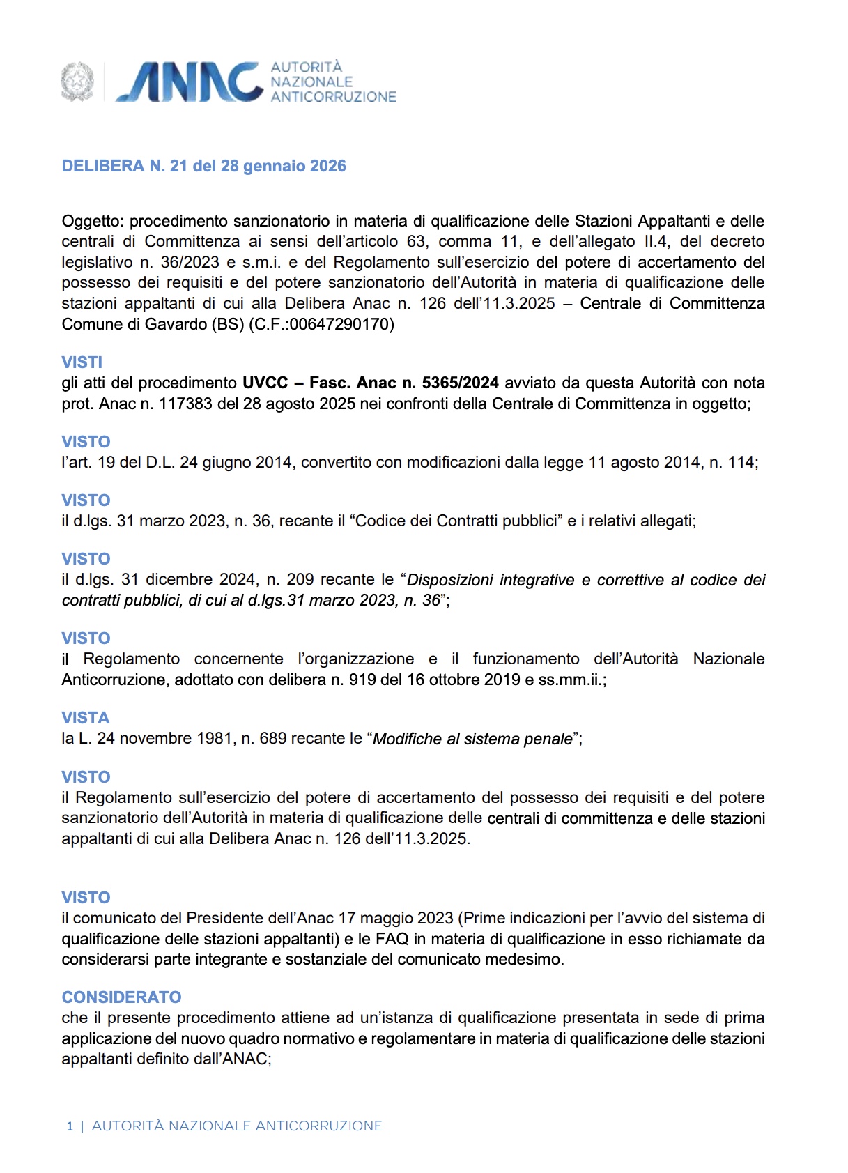 Con Delibera n. 21 del 28 gennaio 2026, l’ANAC, in virtù del potere di accertamento del possesso dei requisiti e del potere sanzionatorio in materia di qualificazione delle Centrali di Committenza e delle Stazioni Appaltanti, di cui alla Delibera ANAC n. 126 dell’11.3.2025, nell’ambito di un procedimento volto a verificare la veridicità delle dichiarazioni rese in fase di qualificazione, ha sanzionato una Centrale di Committenza per una qualificazione presentata in sede di prima applicazione del nuovo quadro normativo e regolamentare in materia.
