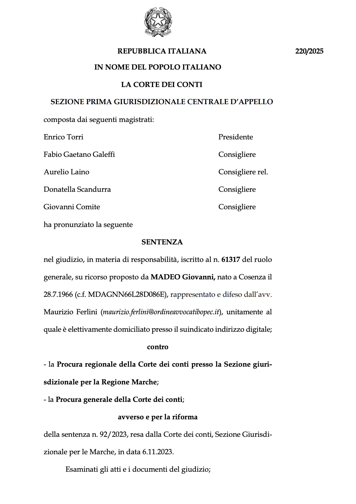 Con la sentenza n. 220/2025, depositata il 23 dicembre 2025, la prima sezione giurisdizionale centrale d’appello della Corte dei Conti ha confermato la condanna per danno erariale a carico di un responsabile unico del procedimento, in relazione all’erogazione di un’anticipazione contrattuale garantita da una polizza fideiussoria rivelatasi contraffatta.