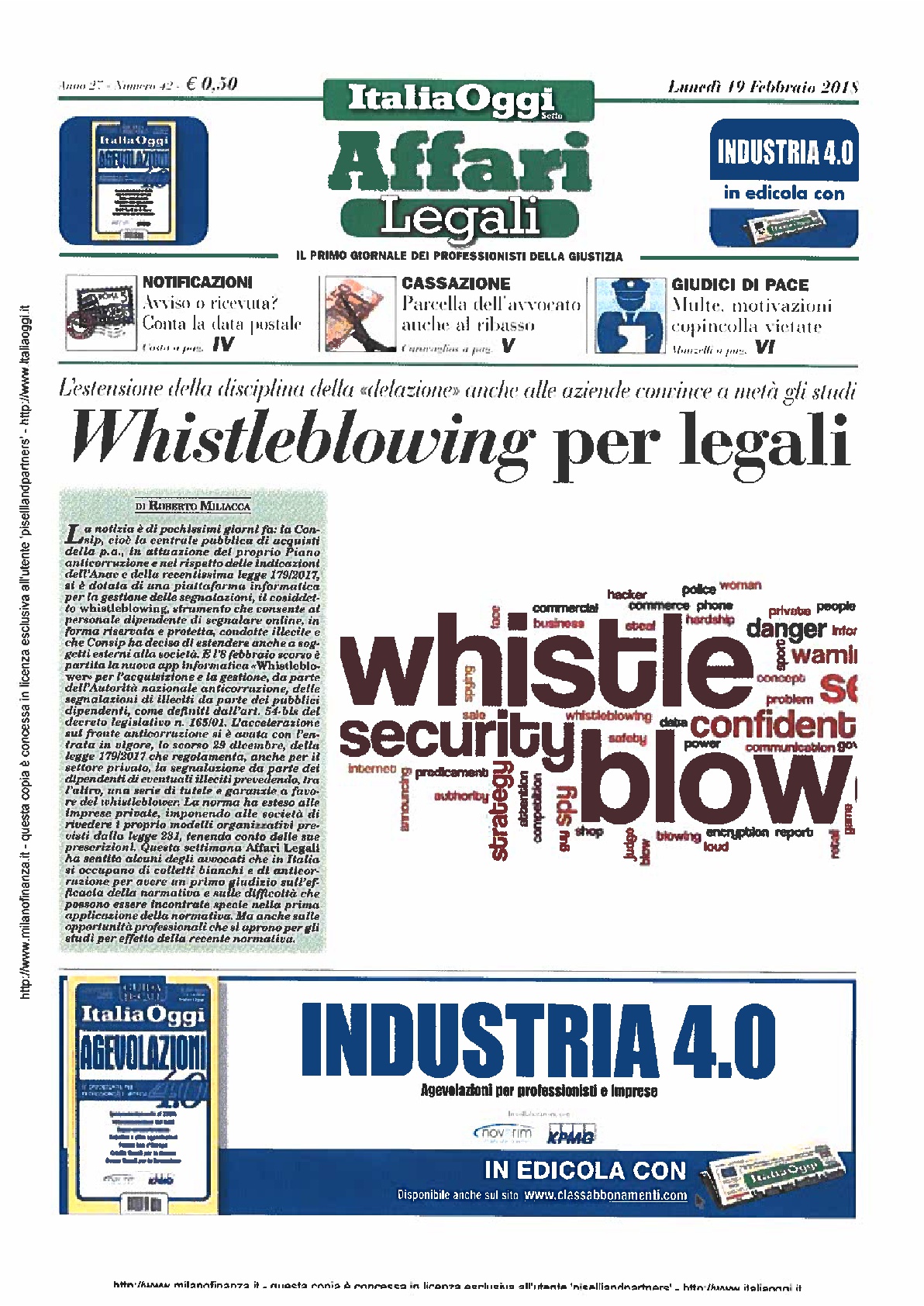 Il prof. Mauro Miccio, of counse dello Studio Piselli & Partners, intervistato da Angelo Costa per Italia Oggi, sottolinea come “l’anonimato della segnalazione, oggi positivamente riconosciuto, attiene più alla protezione del segnalante che al suo stesso contenuto. La possibilità di non rivelare l’identità, tuttavia, può in taluni casi favorire un abuso dello strumento da parte di colore che vogliano diffamare un collega o un superiore. In tal senso, Transparency International Italia, e Allerta Anticorruzione (Alac), con la piattaforma Globaleaks per esempio, ha tentato di ovviare ai problemi dell’anonimato, cercando di renderlo un’opportunità, nonchè di garantire l’effettiva tutela delle due parti coinvolte: sia del segnalante per evitare anche indebitamente effetti discriminatori, sia del segnalato al fine di consentire, fin dall’inizio della procedura interna di verifica e controllo, di poter avere diritto ad una legittima difesa a tutela della sua moralità e della sua professionalità”.