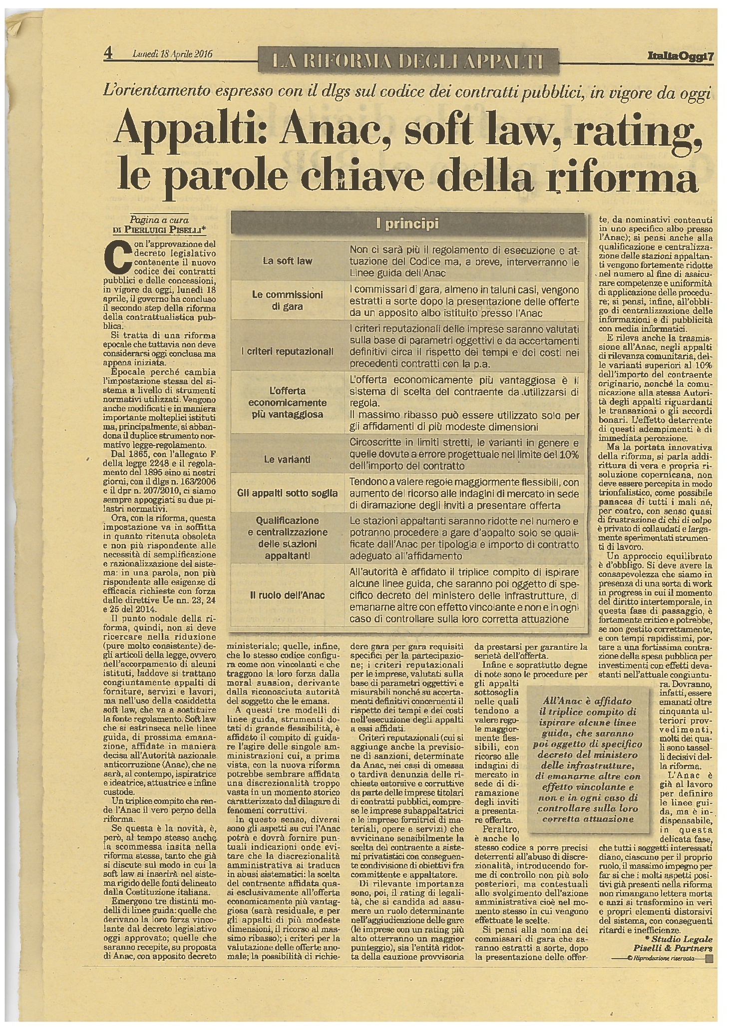 L’Avv. Pierluigi Piselli, fa il punto, allora, sulla riforma appalti nell’articolo “Appalti: Anac, sof law, rating: le parole chiave della riforma” pubblicato da Italia Oggi Sette del 18 aprile.
