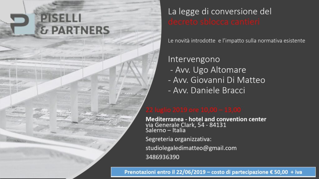 Il 22 luglio u.s. i nostri Avvocati Daniele Bracci e Ugo Altomare in collaborazione con l’Avv. Giovanni Di Matteo sono stati a Salerno, in qualità di relatori, nella giornata di formazione dedicata allo studio delle novità introdotte dalla legge di conversione del d.l. 32/2019 (c.d. “Sblocca-cantieri”), analizzando in particolare l’impatto delle modifiche sulla normativa vigente