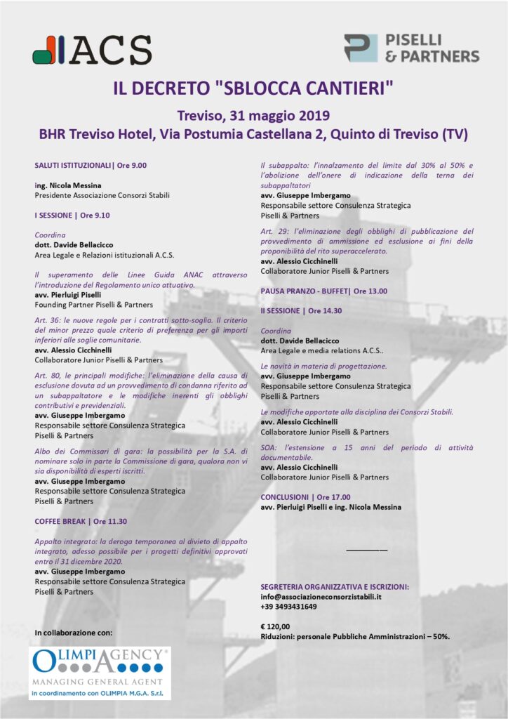 Il 31 maggio u.s. i nostri Avv.ti Pierluigi Piselli, Giuseppe Imbergamo e Alessio Cicchinelli sono stati a Treviso, in qualità di relatori, nella giornata organizzata dal nostro Studio insieme  all’Associazione Consorzi Stabili, per discutere delle novità introdotte dal Decreto Sblocca Cantieri.