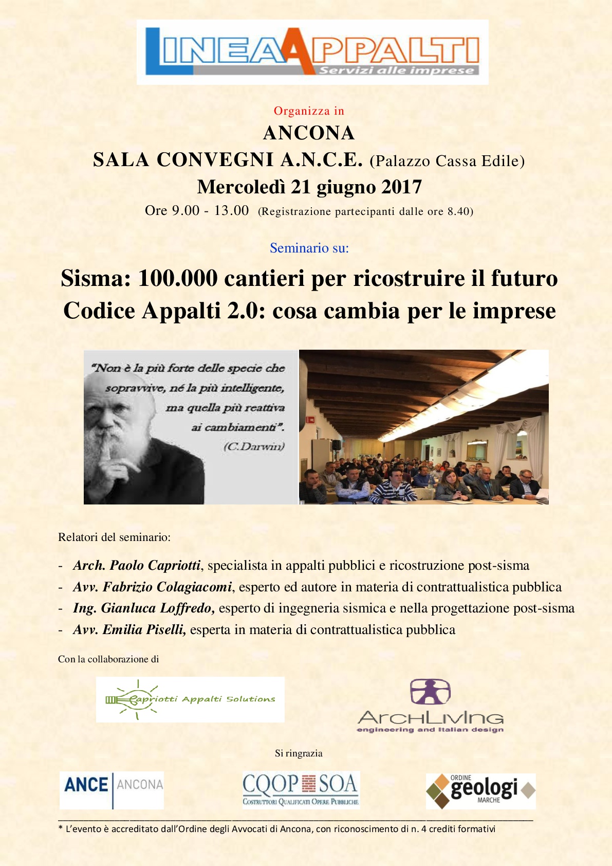 Il 21 giugno u.s. l’Avv. Emilia Piselli è interventuta all’evento gratuito “Sisma: 100.000 cantieri per ricostruire il futuro. Codice appalti 2.0: cosa cambia per le imprese” organizzato da Linea Appalti in collaborazione con Ance Ancona.