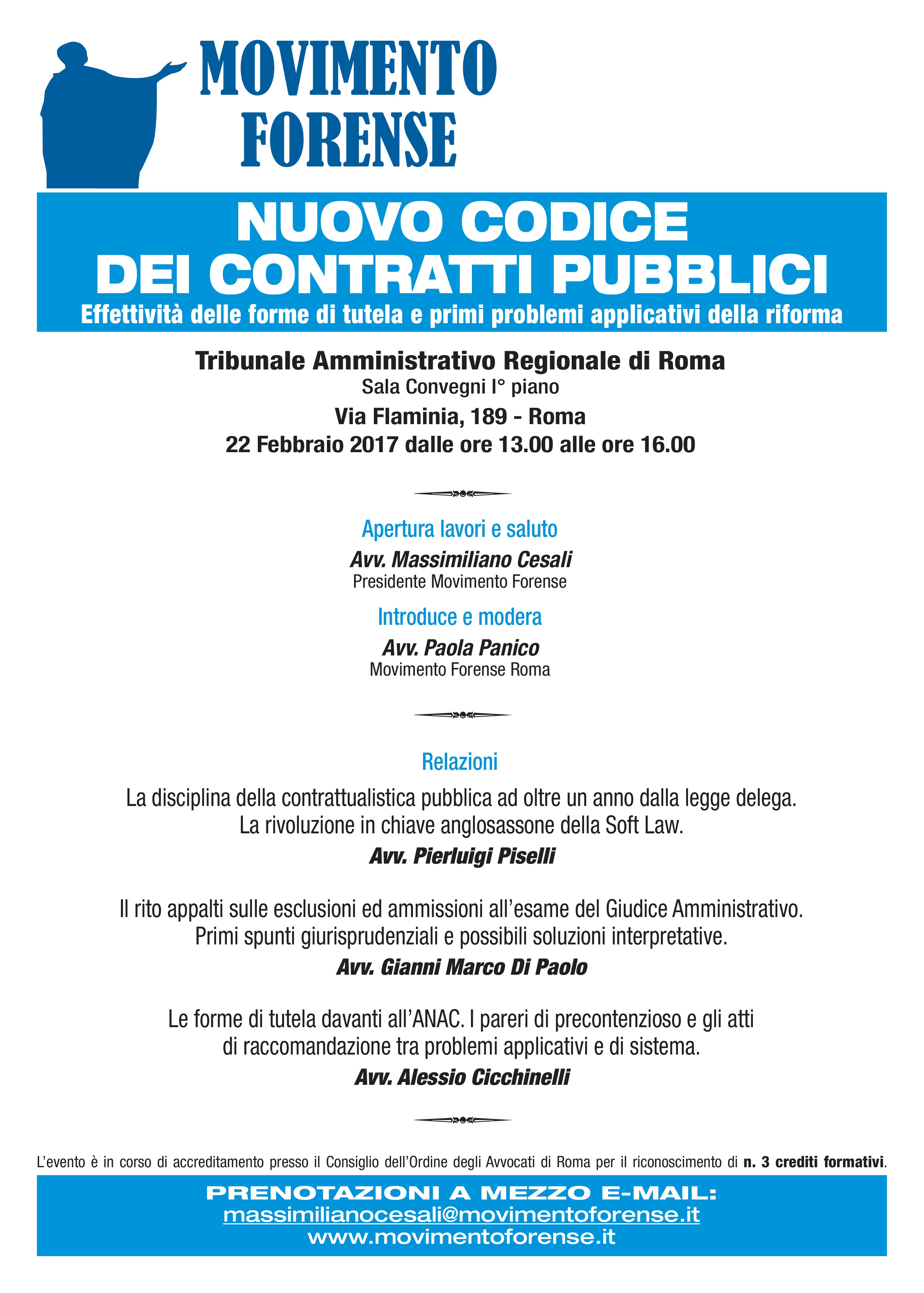 MOVIMENTO FORENSE: CONVEGNO NUOVO CODICE DEI CONTRATTI PUBBLICI PRESSO TRIBUNALE AMMINISTRATIVO REGIONALE DI ROMA