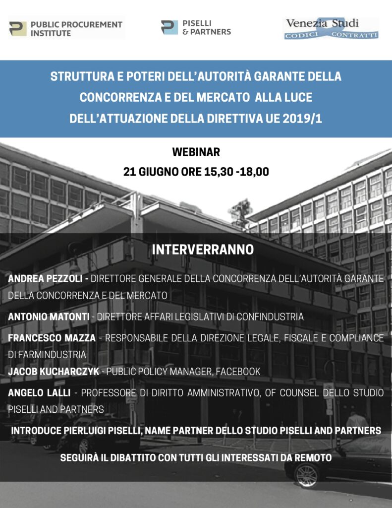 E’ in programma per lunedì 21 giugno p.v., alle ore 15.30, il webinar dal titolo “STRUTTURA E POTERI DELL’AUTORITÀ GARANTE DELLA CONCORRENZA E DEL MERCATO, ALLA LUCE DELL’ATTUAZIONE DELLA DIRETTIVA UE 2019/1″, organizzato dai Professionisti di Piselli&Partners, in collaborazione con PPI – Public Procurement Institute e Venezia Studi.